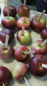 Once mixture is ready, remove from heat and stir in the droplets of color. Then quickly (but carefully) dip the apples one at a time into the mixture, being sure to coat the whole apple. Then place it gently onto the parchment paper or aluminum foil lined pan (do not use wax paper because the heat will melt it onto the apples – yuck!).